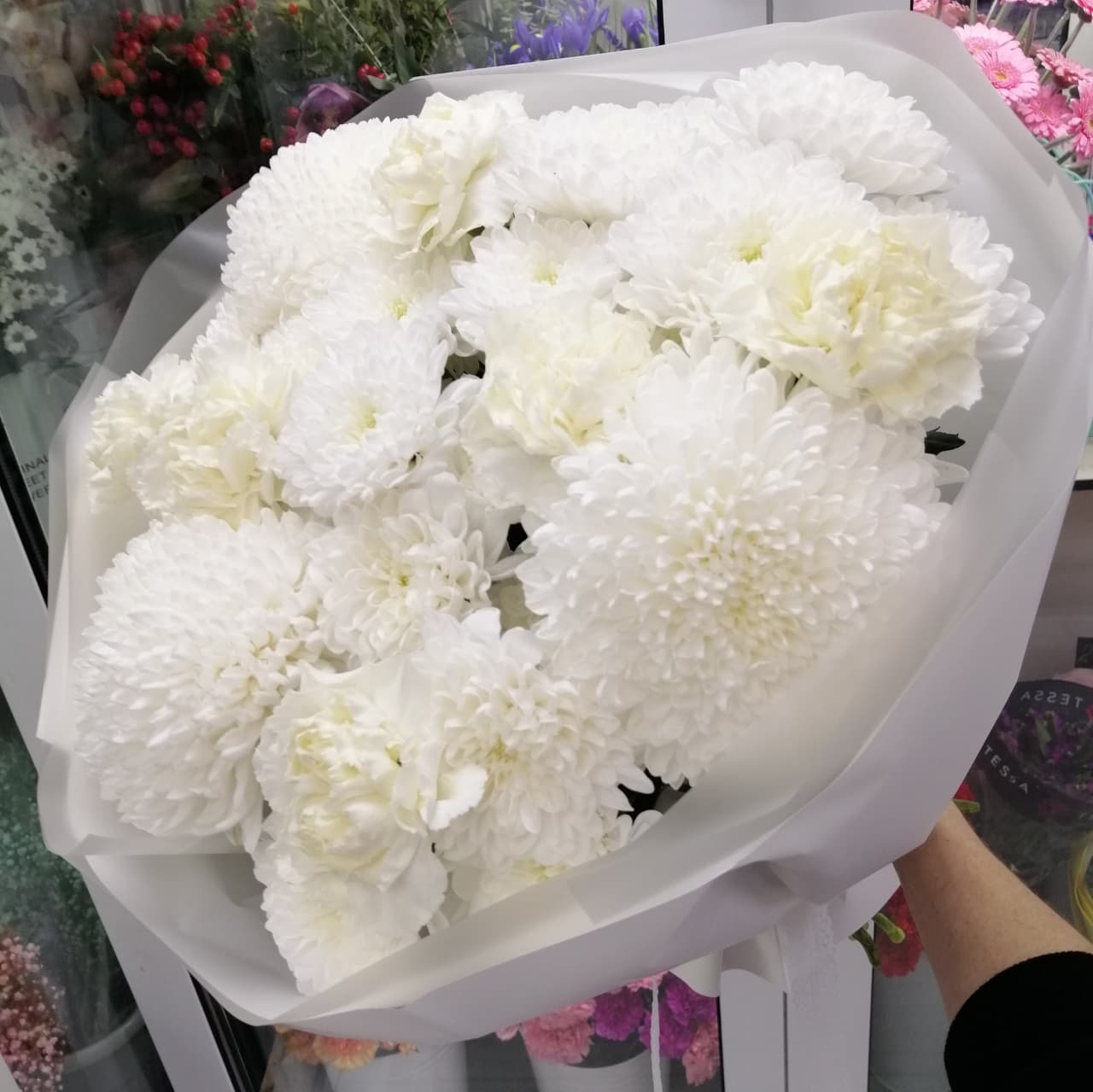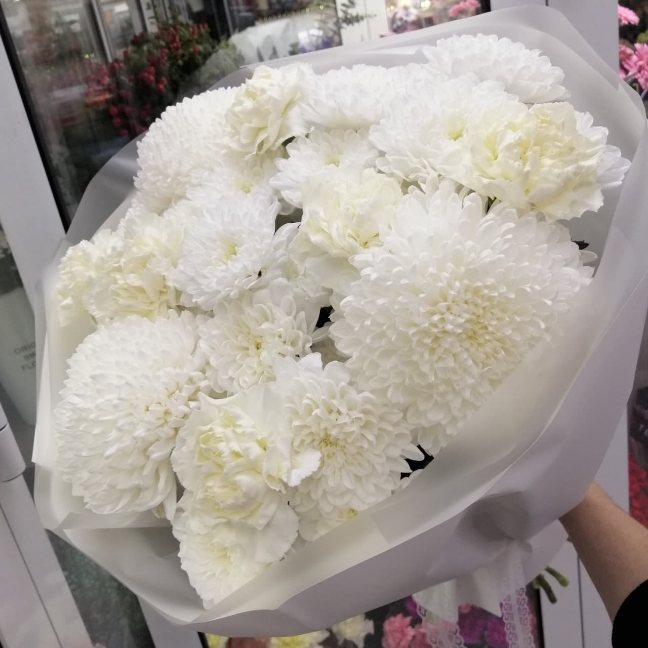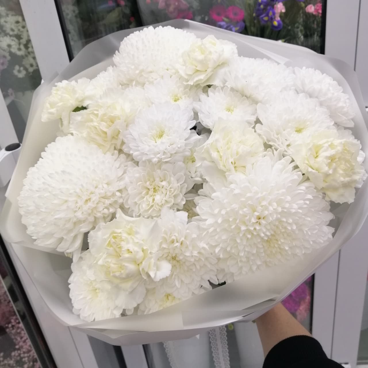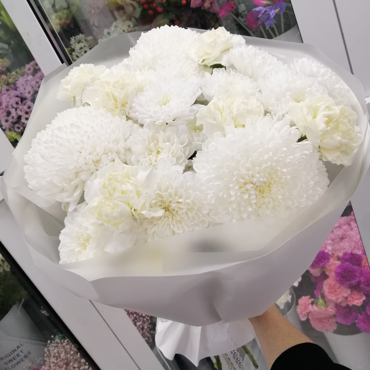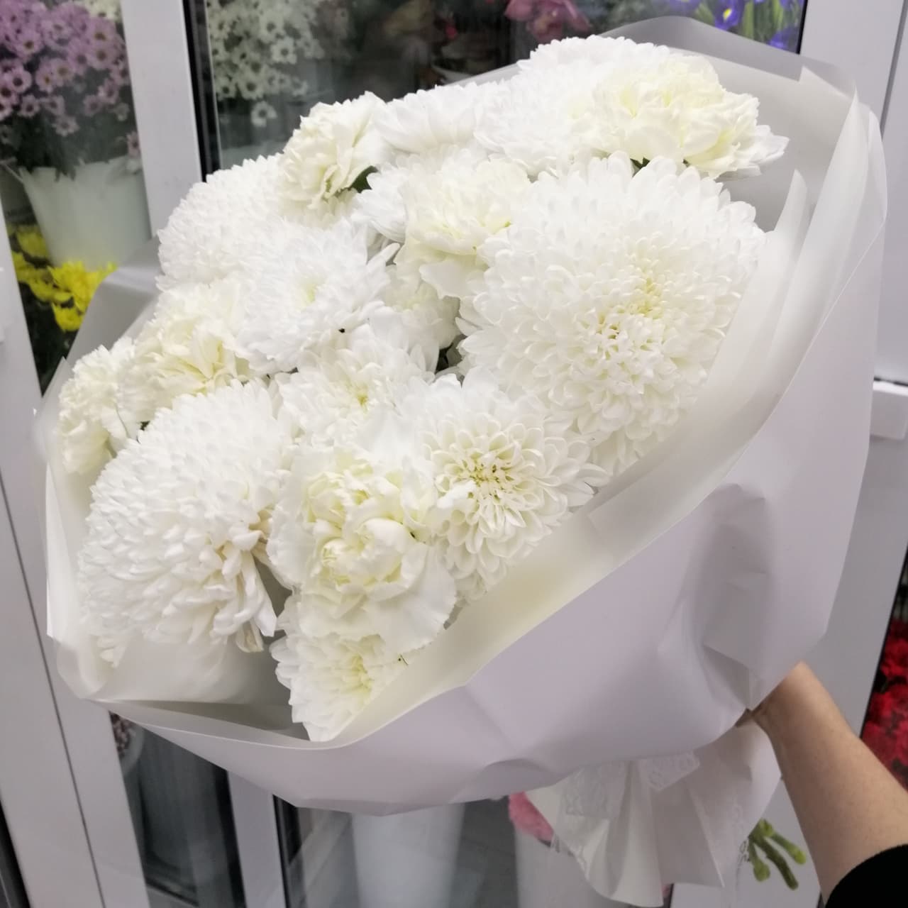 Хризантема крупноцветная Антон (3), хризантема мелкоцветная Алтай (4), гвоздика (6), оформление. Важно!Цена и состав цветов могут отличаться от указанной на сайте.