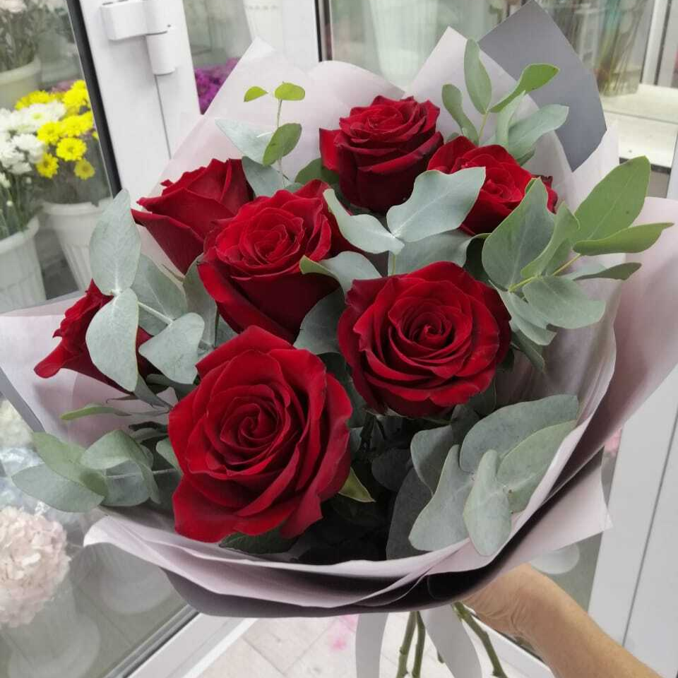 Роза (5), орхидея (5), хризантема (4), эустома (1), лист аспидистры, папоротник, оформление. Важно!Цена и состав цветов могут отличаться от указанной на сайте.